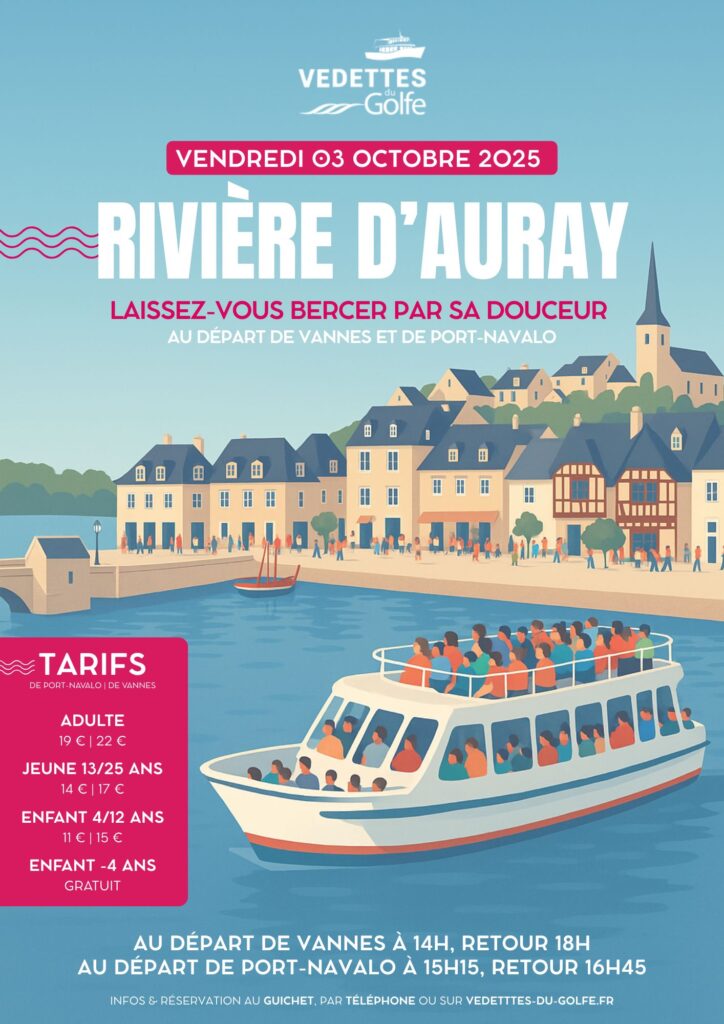 Profitez du dernier départ de la saison pour découvrir les charmes et la quiétude de la rivière d’Auray ce vendredi 03 octobre 2025 au départ de Vannes ou Port-Navalo.